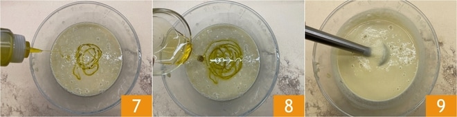 Transfiere las habas cocidas a un bol, añade el aceite 7 y la miel 8, luego tritura con una batidora de inmersión hasta obtener un puré 9.