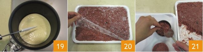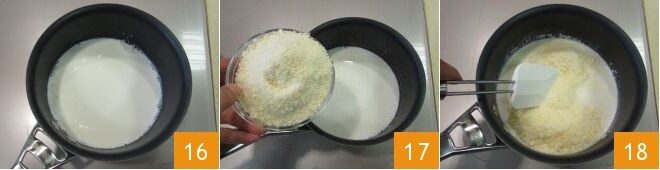 Prepara la salsa de Grana Padano DOP: lleva a ebullición la leche 16, añade el Grana Padano DOP rallado 17 y mezcla bien 18;