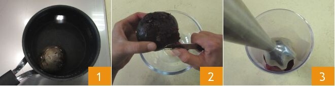 Para preparar la hamburguesa de arroz y remolacha con salsa de Grana Padano, primero lava bien la remolacha y luego cocínala cruda y con toda la piel en abundante agua no salada durante unos 70 minutos o hasta que esté blanda 1. Recuerda conservar el agua de cocción de la remolacha porque la necesitarás para cocinar el arroz. Cuando la remolacha esté cocida, pélala 2 y tritúrala con una batidora de mano 3;