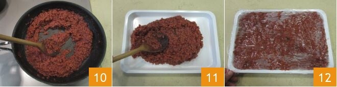 Después de unos 25 minutos, el risotto estará listo, debe estar bien compacto 10. Extiende el arroz sobre una bandeja 11, distribuyéndolo de manera homogénea, cúbrelo con film en contacto 12 y guárdalo en la nevera para que se enfríe bien, ya que debe estar bien frío para poder formar las hamburguesas.