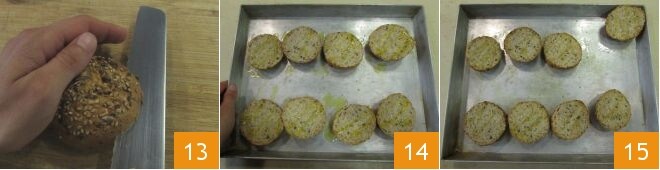 Ahora toma los panes, divídelos por la mitad 13, colócalos en una bandeja de horno, rocíalos con un poco de aceite 14 y tuéstalos en el horno precalentado a 200 grados durante unos cinco minutos, mantén el pan caliente 15 y continúa con las preparaciones.