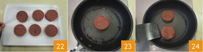 A medida que formes las hamburguesas, colócalas sobre una bandeja forrada con papel de horno 22. Vierte un poco de aceite en una sartén y cuando esté bien caliente, dora tus hamburguesas por ambos lados 23 durante un par de minutos 24.
