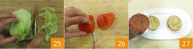 Corta finamente la lechuga iceberg 25 y corta en rodajas el tomate 26. Ahora monta tus hamburguesas de la siguiente manera: coloca la mitad de un panecillo en un plato y luego rellena con las hamburguesas 27,