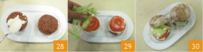 abundante salsa de Grana Padano DOP 28, una rodaja de tomate, la lechuga 29 y cierra con la otra mitad del panecillo 30. Tus hamburguesas de arroz y remolacha con salsa de Grana Padano están listas, ¡disfrútalas de inmediato!