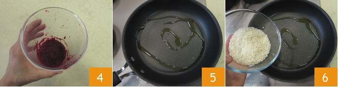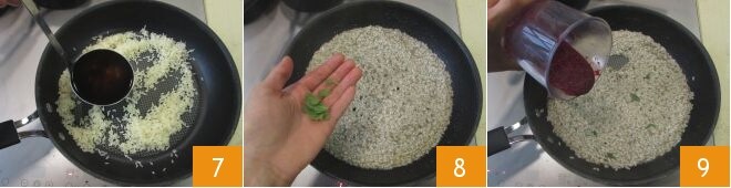 Continúa la cocción del arroz añadiendo el agua de remolacha bien caliente 7. Sala, añade hojitas de menta 8 y, a la mitad de la cocción, vierte el puré de remolacha 9. Remueve para sazonar y continúa la cocción añadiendo el caldo de remolacha según sea necesario.