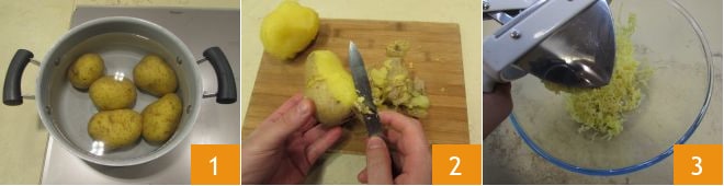 Para preparar las hamburguesas de calabacín comenzamos cociendo las patatas. Sumérjalas en agua fría y desde el momento en que hierva cuente de 30 a 50 minutos 1. Haga la prueba con un tenedor, cuando estén tiernas en el centro escúrralas y pélelas en caliente 2. Finalmente, aplástelas y deje enfriar 3.