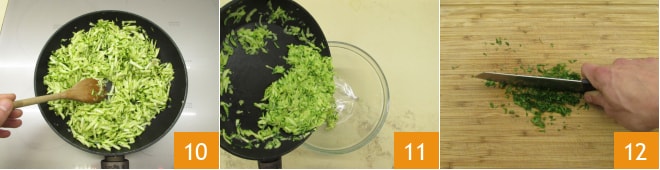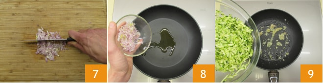 Pele y pique el chalote 7, viértalo en una sartén con un poco de aceite 8. Sofría por poco tiempo mezclando de vez en cuando, luego añada los calabacines 9.