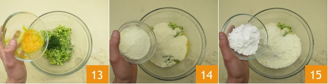 Vierta las hierbas en el bol con los calabacines y añada los huevos 13, la harina de almendra y el queso rallado 14, la fécula 15.