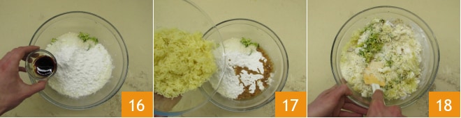 Agregue la salsa de soja 16 y las patatas aplastadas 17. En este punto puede amasar todo obteniendo una masa homogénea; asegúrese de que esté bien de sal 18.