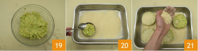 Deje reposar la masa unos minutos 19. En una fuente vierta el pan rallado, coloque un cortador de galletas de aproximadamente 10 cm de diámetro y 3 cm de alto y llénelo con la masa 20. Forme 5 hamburguesas de calabacín y espolvoree en la superficie con el pan rallado 21.