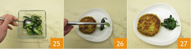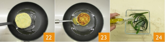 Caliente un poco de aceite en una sartén antiadherente y cocine los medallones 22. Cuando la base esté dorada y crujiente, déles la vuelta y cocine también por el otro lado 23. Mientras se cocinan, puede utilizar la parte exterior de los calabacines como guarnición, adornándola a su gusto con sal y aceite 24.