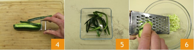 Después de limpiar los calabacines, quíteles los extremos y retire la parte exterior con un pelador de patatas 4, guárdela a un lado porque la necesitará después 5. Ralle la parte clara de los calabacines con un rallador de agujeros grandes 6.