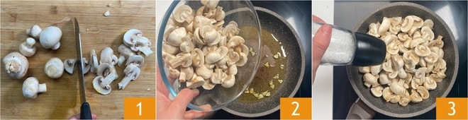 Para preparar la hamburguesa de champiñones, primero elimina la base terrosa de los champiñones, luego córtalos toscamente 1. En una sartén, sofríe con el aceite y el diente de ajo cortado en rodajas, luego añade los champiñones 2 y sala de inmediato 3.