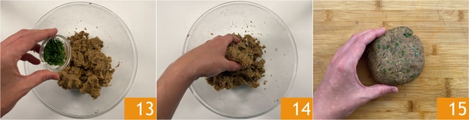 Sazona con una pizca de sal, pimienta y perejil picado 13. Amasa con las manos 14 hasta obtener una mezcla suave y homogénea 15.