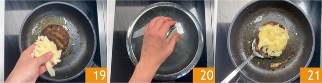 Cocina durante 3-4 minutos a fuego medio, luego dale la vuelta con cuidado y añade los pétalos de fontina 19. Cubre con la tapa y deja cocinar durante un par de minutos más 20. Cuando el queso se haya derretido, retira la hamburguesa de la sartén 21 y procede de la misma manera para cocinar las demás.