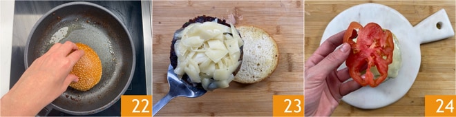 Antes de montar las hamburguesas, puedes calentar el pan colocando la parte cortada en la misma sartén donde cocinaste los medallones, para que se impregne del fondo de cocción 22. En este punto, puedes poner la hamburguesa de champiñones con queso sobre la base del pan 23, luego añade una rodaja de tomate 24.