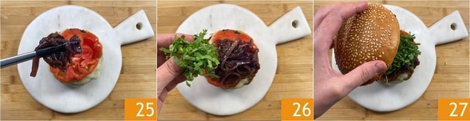 Completa con las cebollas caramelizadas 25 y achicoria en juliana 26. Cubre con la otra mitad del pan 27 y sigue así para montar las demás. ¡Tu hamburguesa de champiñones está lista para ser devorada!