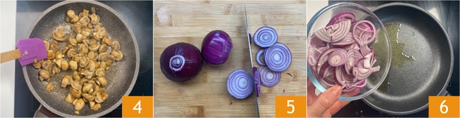 Dora los champiñones a fuego medio durante unos 10 minutos, removiendo con frecuencia, luego apaga el fuego y deja que se templen 4. Mientras tanto, pela las cebollas y córtalas en rodajas finas 5. Coloca las cebollas en una sartén con el aceite caliente 6.