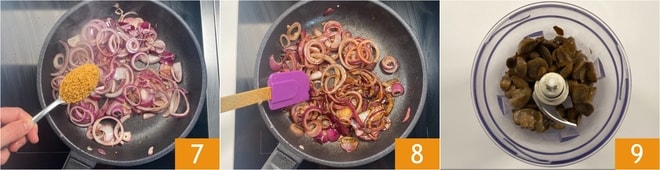 Añade el azúcar moreno 7 y cocina a fuego medio durante unos 5 minutos 8. Reserva las cebollas caramelizadas y transfiere los champiñones templados a un procesador de alimentos 9.