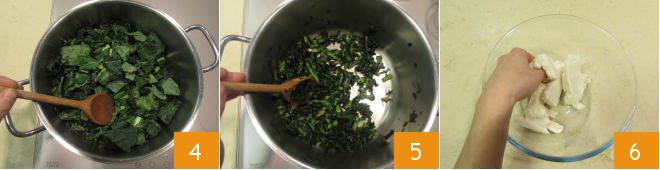 y cocínala, removiendo de vez en cuando 4 hasta que esté marchita y blanda 5: tardará unos 10 minutos. Rompe el pan con las manos y colócalo en un bol 6.