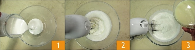 Para preparar el helado fácil de cereza, verted la nata en un bol 1 y empezad a montarla con las varillas eléctricas 2. Cuando esté casi completamente montada, añadid la leche condensada 3
