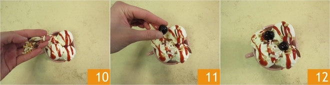 Unid un poco de granillo de almendra y de avellanas 11. Decorad con un par de cerezas en almíbar 11 y servid vuestro helado 12.