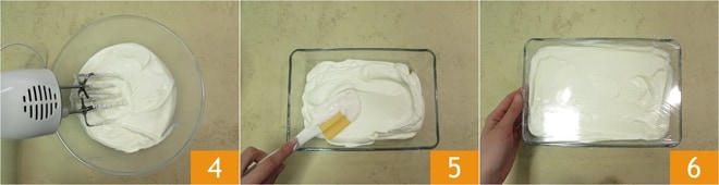 y continuad montando hasta obtener un compuesto denso y homogéneo 4. Transferidlo a un recipiente bajo y ancho, nivelad con una espátula 5 y cubrid con film transparente 6. Ponedlo en el congelador durante al menos 3 horas.
