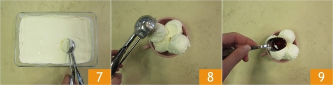 Pasado el tiempo necesario, tendrá la consistencia típica del helado. Utilizando un sacabolas, sacad el helado 7 y ponedlo en una copa 8. Añadid por encima un poco de jarabe de cerezas 9.