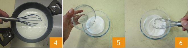 Remueve de vez en cuando para que la leche no se pegue 4, que deberá llegar a ebullición. Mientras tanto, mezcla en un bol azúcar y harina de semillas de algarrobo 5; mezcla con una varilla hasta que estén completamente mezclados y no haya grumos 6.