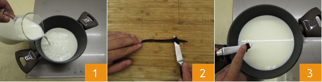 Para preparar el helado fiordilatte lo primero que debes hacer es verter la leche en un cazo 1, encender a fuego moderado. Mientras tanto, abre la vaina de vainilla y extrae solo las semillas 2, que transferirás al interior de la leche 3.