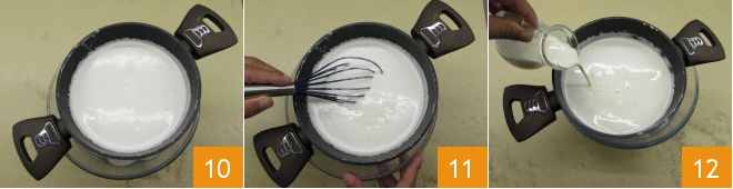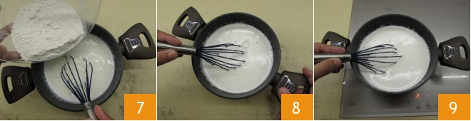 Tan pronto como la leche comience a hervir, retírala del fuego y, removiendo continuamente con la varilla, añade la mezcla de polvos muy lentamente 7; de esta manera evitarás la formación de grumos. Cuando se haya absorbido bien 8, vuelve a colocar la olla en el fuego y llévala a ligera ebullición, continuando a mezclar bien y constantemente 9.