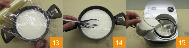 La base está lista, cubre la olla con film transparente 13 y transfiérela al refrigerador para que madure por un mínimo de 4 horas y un máximo de 12. Recupera la cacerola del refrigerador y mezcla con una varilla 14, durante el reposo de hecho los azúcares podrían depositarse en el fondo y las grasas aflorar en la superficie. En este punto, dependiendo de la heladera que utilices, saca una cantidad adecuada de mezcla. Viértela dentro de la máquina 15.