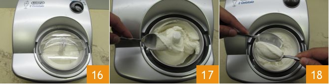y actívala 16. La mantecación durará aproximadamente 40-50 minutos, en cualquier caso, este tiempo también puede variar según la máquina utilizada. El resto de la mezcla puedes conservarla en el refrigerador y mantecarla posteriormente. Tan pronto como haya alcanzado una consistencia cremosa 17 puedes apagar la máquina. Si quieres disfrutarlo de inmediato usando dos cucharas humedecidas, saca las porciones individuales "a quenelle" ayudándote con dos cucharas 18