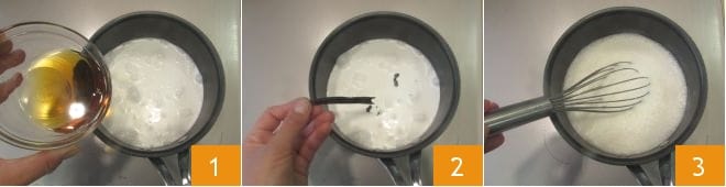 Para preparar el helado golden milk, vierte la leche de coco en un cazo, añade el sirope de arce 1 y aromatiza con las semillas y la vaina de vainilla 2. Lleva la mezcla a ebullición mezclando con una espátula de silicona o un batidor 3.