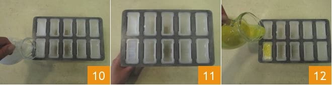 Toma un molde para polos con capacidad de 70 ml para cada palito y rellénalo con la mezcla blanca, distribuyéndola equitativamente dentro de 6 compartimentos 10, luego coloca el molde en el congelador durante unos 10 minutos. Pasado este tiempo, retira el molde 11 y vierte la mezcla especiada sobre la blanca 12.