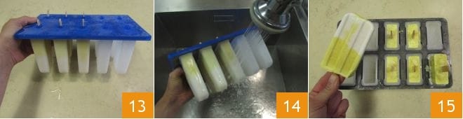 En este punto, cubre con la tapa, añade los palitos 13 y deja que se endurezca en el congelador durante al menos 5 horas. Al momento de extraer los helados, pasa rápidamente el molde bajo agua corriente para facilitar la operación 14 y disfruta de tu helado golden milk para una pausa regeneradora 15!