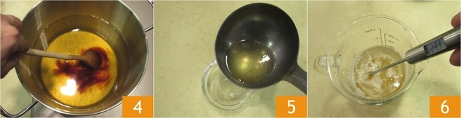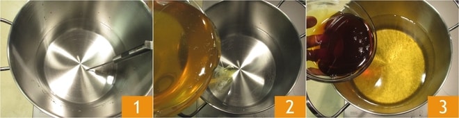 Para preparar el hidromiel, primero calienta el agua a una temperatura entre 38°C y 45°C, midiendo con un termómetro 1. Toma un cucharón de agua y resérvalo en una jarra, luego vierte en la olla la miel de acacia 2 y la miel de castaño 3.