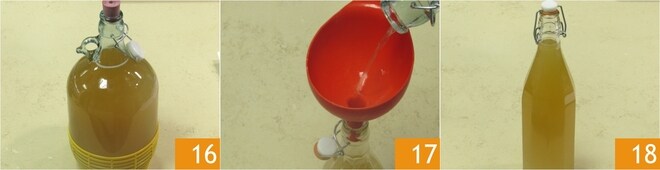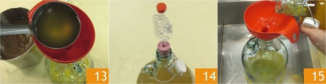 Transfiere la mezcla obtenida en una damajuana de 5 litros con la ayuda de un embudo 13 y sella con un tapón provisto de burbujeador 14. Guarda la damajuana alejada de la luz directa en un lugar fresco con una temperatura entre 18°C y 20°C durante al menos 30 días y hasta un máximo de 60. Durante los primeros 7 días recuerda mover la damajuana en sentido rotatorio para mezclar el contenido un par de veces al día. Pasado este período de fermentación, transfiere el hidromiel a otra damajuana teniendo cuidado de dejar el sedimento en el fondo 15.