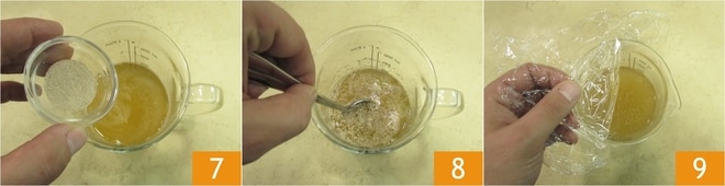 Agrega la levadura 7 y mezcla con delicadeza 8, luego sella la jarra con film transparente 9 y deja reposar alejada de la luz directa durante unos 30 minutos.