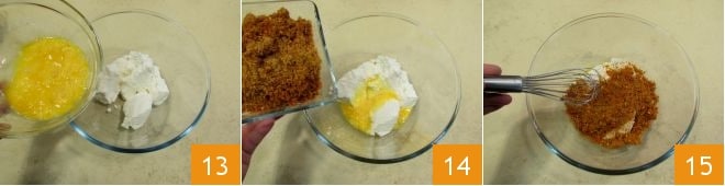 Bate los huevos en un recipiente (reserva una pequeña cantidad) y añádelos a la ricotta 13; vierte también la mezcla de pistachos y pan rallado que has preparado (reservando 3 cucharadas) 14 y mezcla con las varillas 15