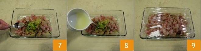 Coloca el pescado que has limpiado en una fuente (reserva 5 gambas para la decoración final), vierte el aceite 4, añade la ralladura de lima 5 y el cebollino picado finamente 6.