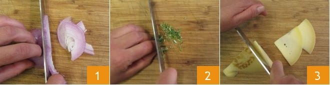 Para realizar el hojaldre multigusto, pela y corta finamente las cebollas, luego deshoja el tomillo, pica las agujas de romero 2 y el cebollino. Corta en rodajas finas también el caciocavallo 3 y reserva.