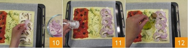 y las cebollas 10. Condimenta con sal 11 y aceite de oliva 12, luego cocina en horno estático a 190° por unos 15 minutos en la rejilla central.