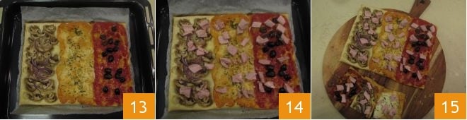 Cuando esté lista la cocción, saca el hojaldre multigusto del horno 13, sazónalo con trozos de atún, después de haberlo escurrido 14 y sírvelo bien caliente 15!