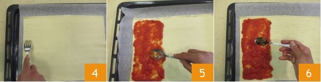 Ahora cubre con papel de horno una bandeja, coloca encima el hojaldre rectangular y pínchalo con los dientes de un tenedor 4. Cubre un tercio del hojaldre con el puré de tomate 5 y sazona con las aceitunas deshuesadas 6.