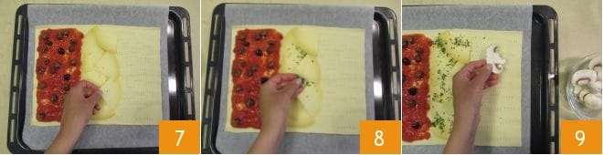 Ahora rellena la franja central con el caciocavallo en rodajas 7 y aromatiza con las hojas de tomillo y el romero y el cebollino picados 8. Para terminar, completa la última franja de masa con las setas en rodajas 9.