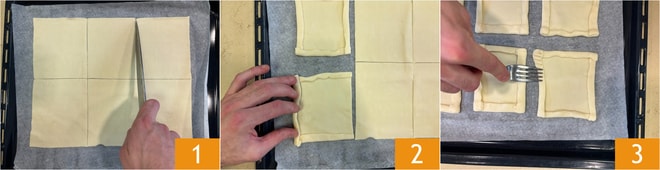 Para preparar los hojaldres con fresas empezad por la base: desenrollad el hojaldre directamente sobre una bandeja de horno y cortadlo en 6 rectángulos 1. Doblad los bordes hacia adentro 2 y presionad con los dientes de un tenedor para crear un motivo decorativo 3.