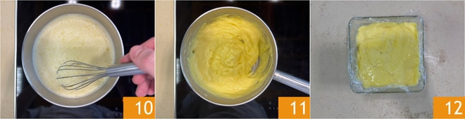 Cocinad a baja temperatura durante unos 10 minutos removiendo con la varilla 10 hasta que la crema pastelera comience a espesar 11. Retirad la crema del fuego, transferidla a una fuente, dejad que se temple, luego cubrid con film en contacto y dejad enfriar bien en el frigorífico.