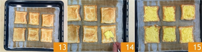 Mientras tanto, los hojaldres estarán cocidos, así que sacadlos del horno y dejad que se enfríen 13. Estaréis listos para montar los dulces: rellenad las bases con la crema pastelera 14 15.