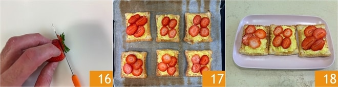 Lavad las fresas, eliminad el pedúnculo 16 y cortadlas en rodajas. Distribuid las rodajas de fresas sobre la crema 17 y servid inmediatamente vuestros hojaldres con fresas 18!